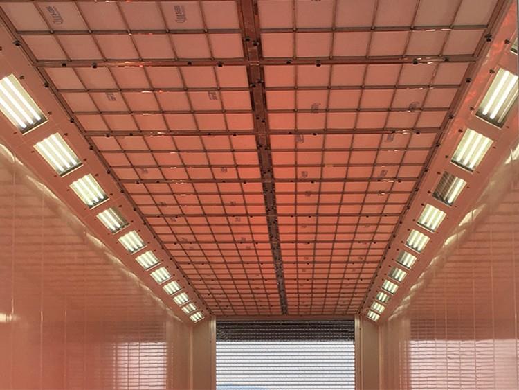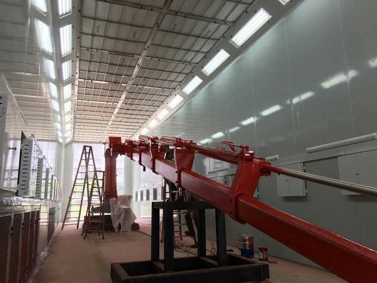 3, 6 zestawów wentylatora odśrodkowego 7,5KW do wlotu powietrza, 3 zestawy napędu 11KW z napędem pasowym, duży wentylator wirnika dla powietrza wywiewanego, zapewniający liczbę zmian powietrza w pomieszczeniu, co sprzyja rozładowaniu mgły lakierniczej.